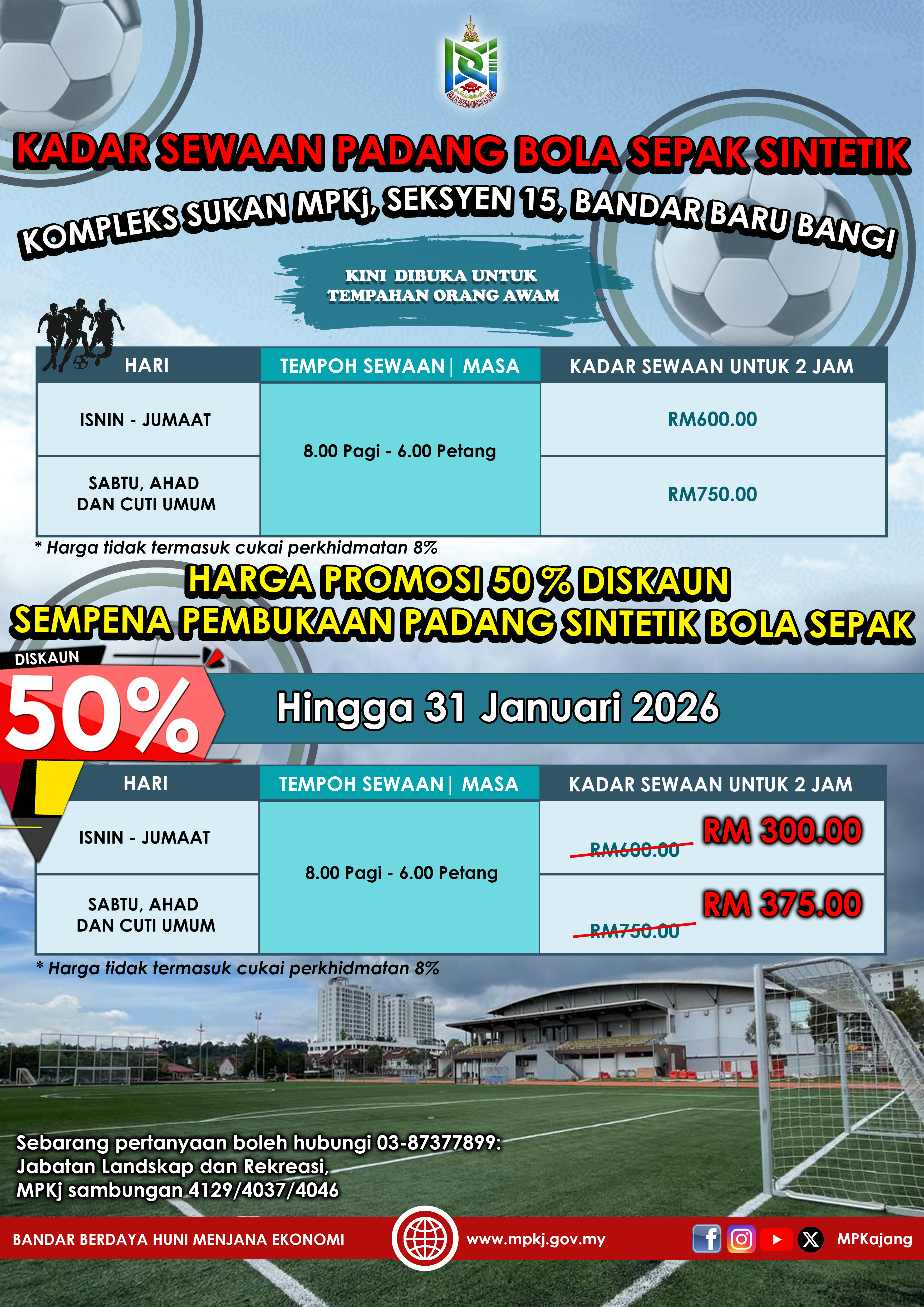 Sewaan Padang Bola Sepak Sintetik, Kompleks Sukan Majlis Perbandaran Kajang, Seksyen 15, Bandar Baru Bangi